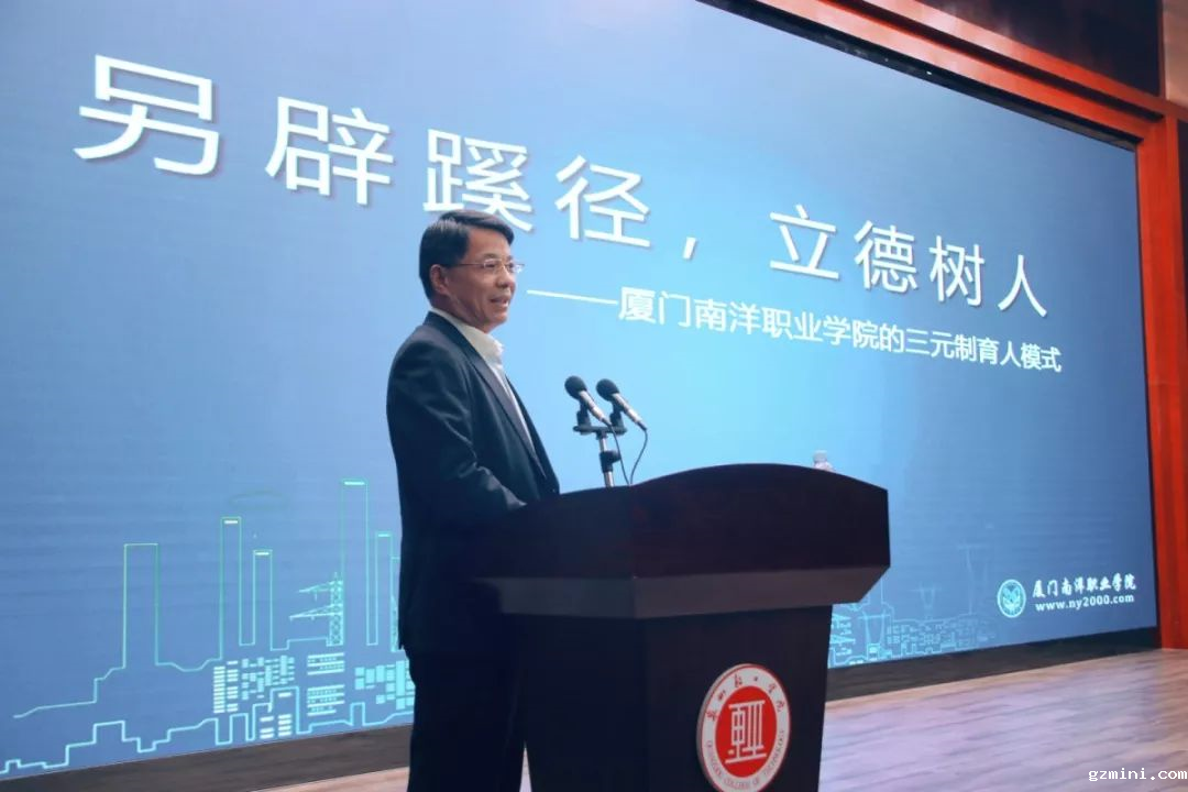 厦门南洋学院董事长、中华职业教育社常务理事鲁加升以“另辟蹊径,立德树人——厦门南洋职业学院的三元制育人模式”为题作演讲。
