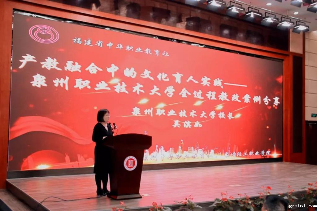 泉州职业技术大学校长吴滨如作题为“产教融合中的文化育人实践——泉州职业技术大学全过程教改案例分享”的演讲。